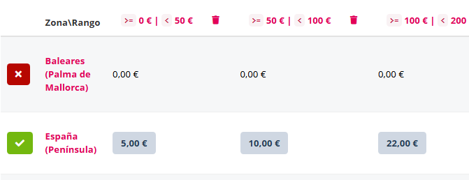 - Los rangos en la intersección con las filas de las zonas habilitadas presentan un campo para especificar el importe de gasto de envío a aplicar cuando se cumpla la lógica de valor mínimo y valor máximo del rango.