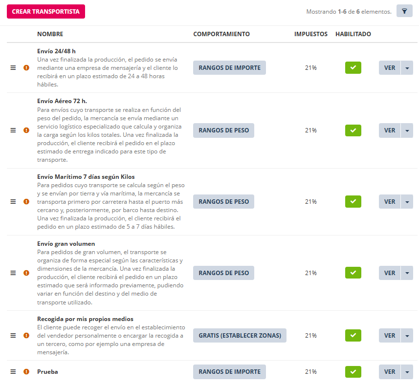 - Los rangos se aplican a las zonas según decisión del administrador y de su estrategia de envíos habilitando o deshabilitando las zonas en la interfaz de rangos del transportista.