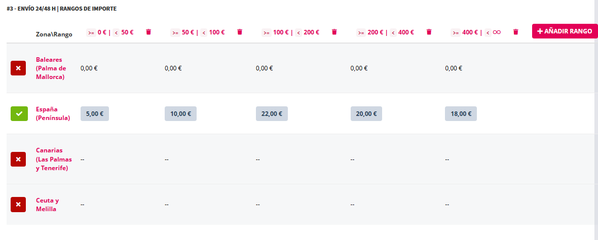 - Para cada rango se puede especificar un importe de gastos de envío sin IVA único en cada zona en el mismo transportista.