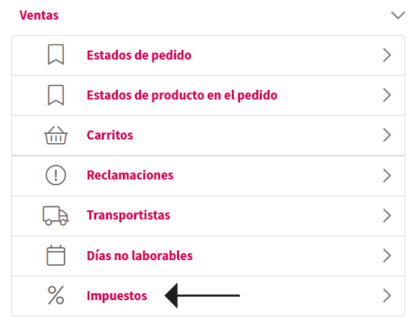 - Desde esta sección de ajustes se crean los tipos de impuestos a usar en los productos y en los gastos de envío.