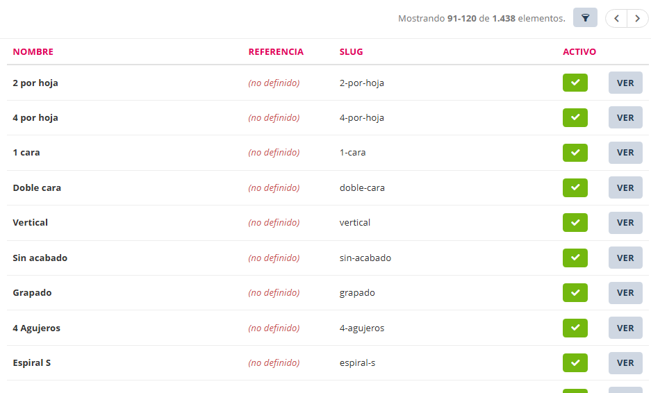 | Paginación | Informa sobre valores que se muestran por página y totales creados. Dispone de botones de flechas para pasar o retroceder páginas. |