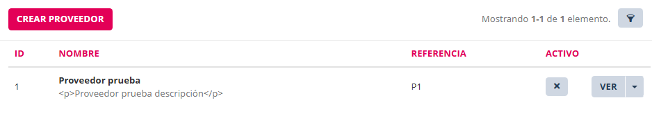 Activo Botón de activar o desactivar proveedor. En magenta activa. En blanco desactivada.