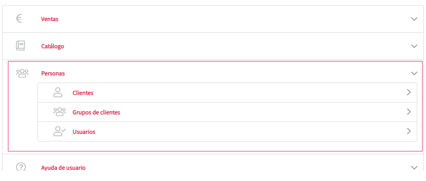 Desde el elemento del Gestor>Navegador lateral>Ajustes>Personas se accede al menú de ajustes relacionados con los usuarios y clientes. Al acceder a Personas muestra los accesos a: