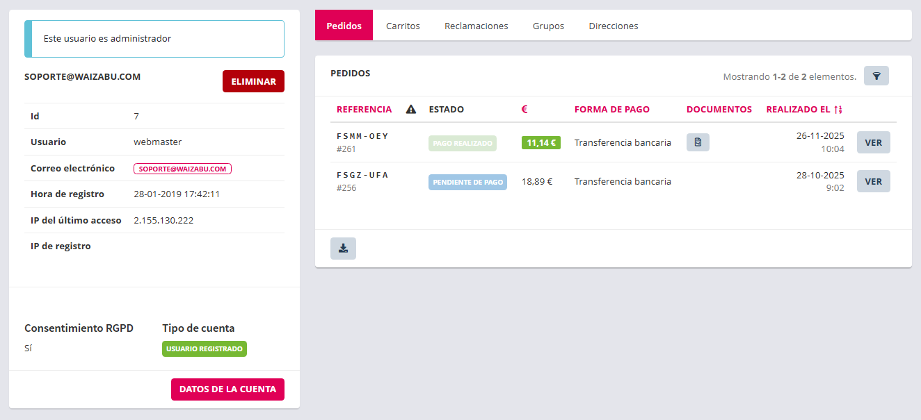 La ficha de cliente muestra la información completa del usuario seleccionado, con pestañas para consultar pedidos, carritos, reclamaciones, grupos y direcciones.