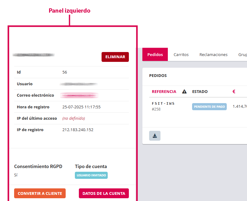 Botón "CONVERTIR A CLIENTE" Acción de convertir al usuario invitado en usuario registrado. A tener en cuenta la necesidad de obtener el consentimiento fehaciente del cliente antes de aplicar esta acción.