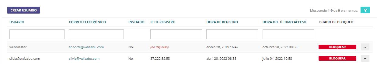 Cada fila del listado dispone de un botón para bloquear y una interfaz con más acciones que se despliega al hacer clic en la flecha.  Al desplegar el botón muestra acciones de actualizar y eliminar.