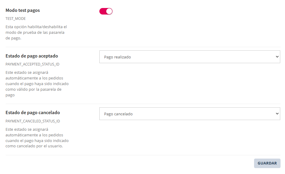 | Estado de pago aceptado | Ajuste para definir el estado de pedido que se asignará automáticamente a los pedidos cuando el pago haya sido indicado como válido por la pasarela de pago. |