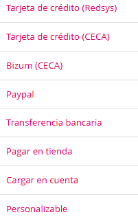 La interfaz de formas de pago presenta un menú interno para acceder a los ajustes correspondientes para cada tipo de forma de pago.