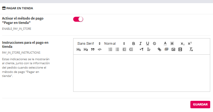 Imagen de los ajustes necesarios para configurar el método de pago mediante pago en tienda.
