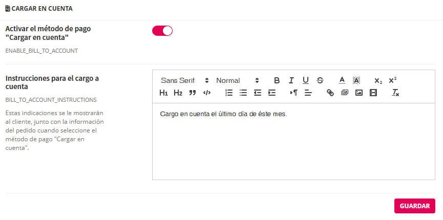Cuando un cliente tramita un pedido seleccionando esta forma de pago, se le mostrarán en pantalla las instrucciones establecidas por el administrador de la tienda. Para ello, el sistema dispone de un editor de texto avanzado que permite redactar y formatear dichas instrucciones.