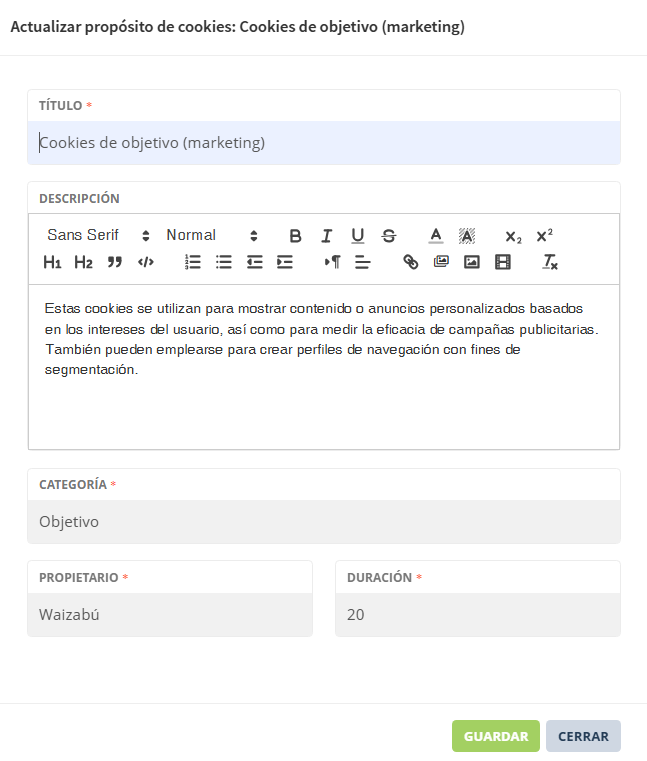 Descripción: explicar el uso de las cookies asociadas a este propósito.