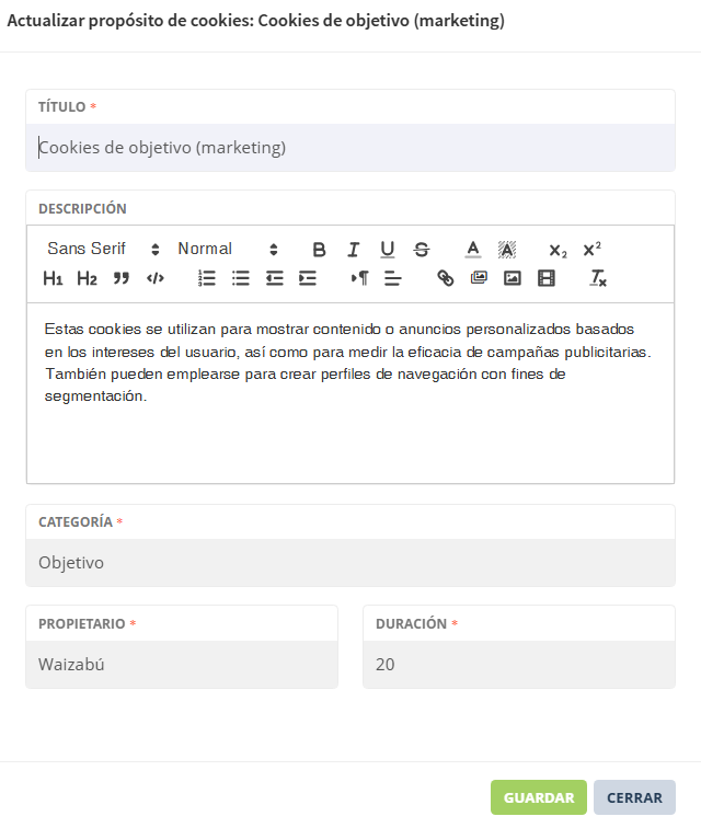 2.8.9.6 Pasos para actualizar propósito de cookies - Privacidad