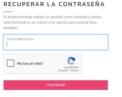 5. El cliente escribe la cuenta de correo con la que tramitó pedidos como invitado. Si se tiene activada a verificación por captcha (recomendable) tendrá que marcar la casilla correspondiente para poder continuar.