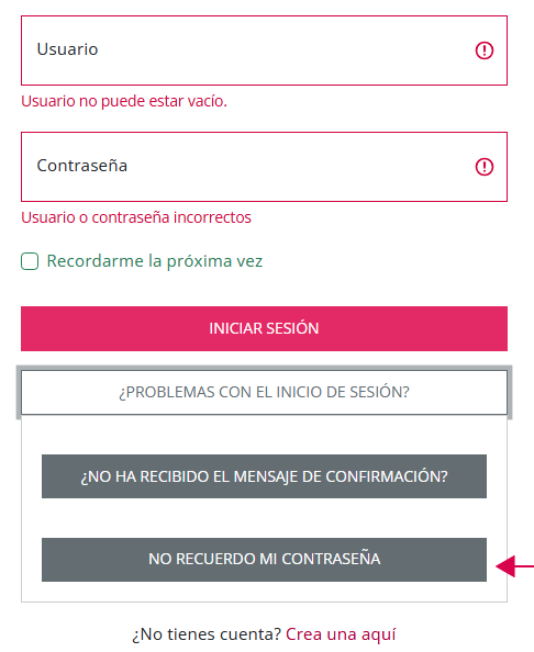 3. Hacer clic en botón "NO RECUERDO MI CONTRASEÑA".