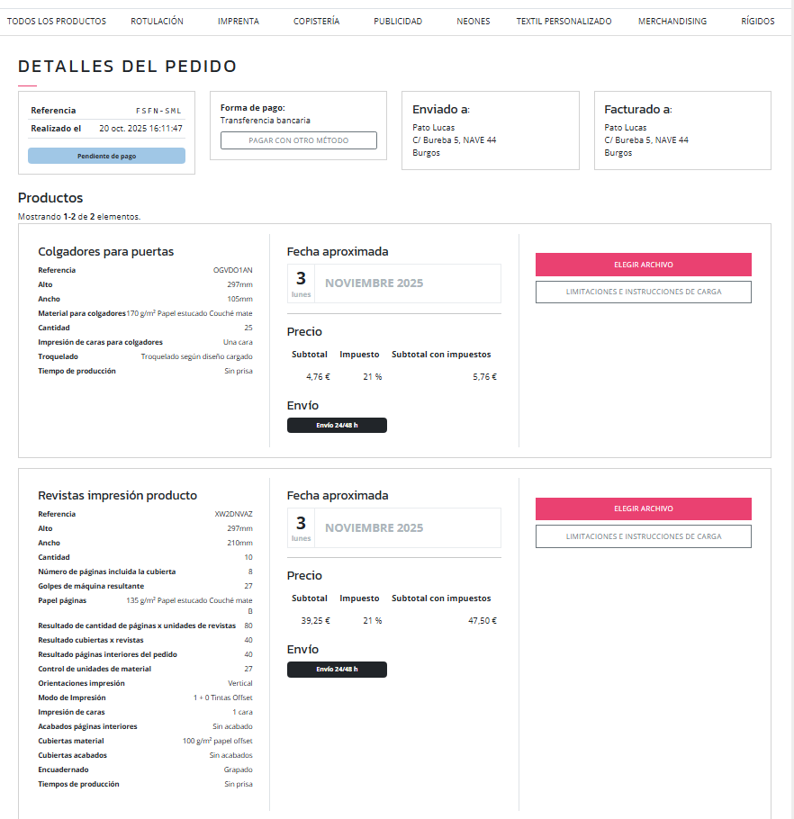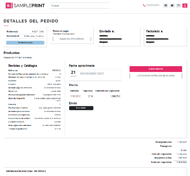 - Datos del pedido, como referencia del pedido, datos de envío y facturación, forma de pago y estado del pedido.