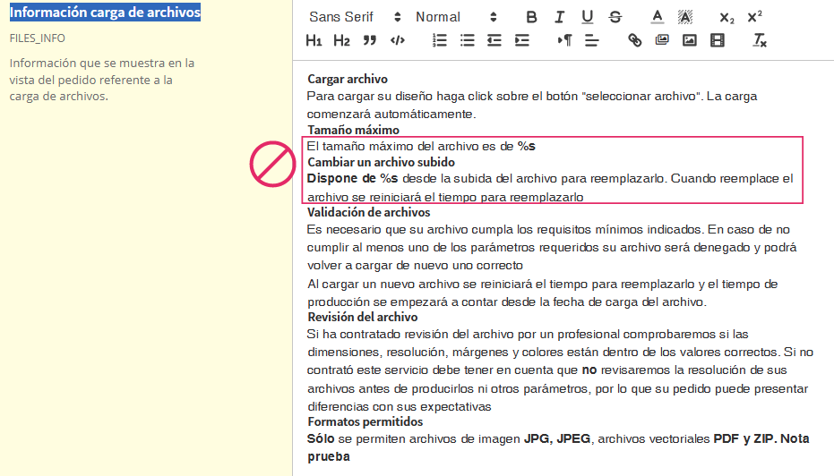 En la sección del menú del gestor Ajustes>Ajustes generales>Información carga de archivos presenta editor de texto para actualizar o añadir más información, con una salvedad.
