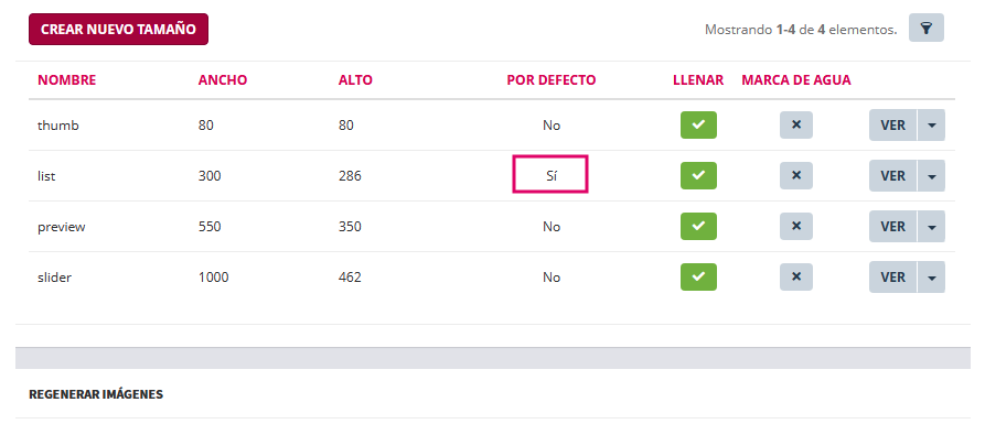 Es posible que en algunas versiones al actualizar la tienda no se muestren algunas imágenes de los productos. Puede ser debido a que en Ajustes -> Apariencia->Tamaños de Imágenes no esté marcada como imagen por defecto la de tipo "list". Si no está establecida como por defecto puede darse el fallo de visualización e imágenes de productos.