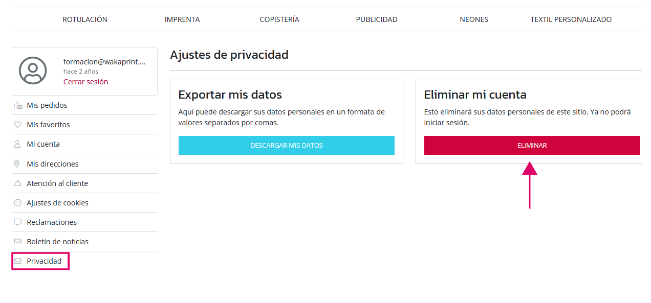Dese Ajustes -> Personas -> Usuarios el administrador puede eliminar las cuentas que no tengan pedidos tramitados. - Eliminar cuenta de usuarios con rol de cliente con pedidos tramitados.