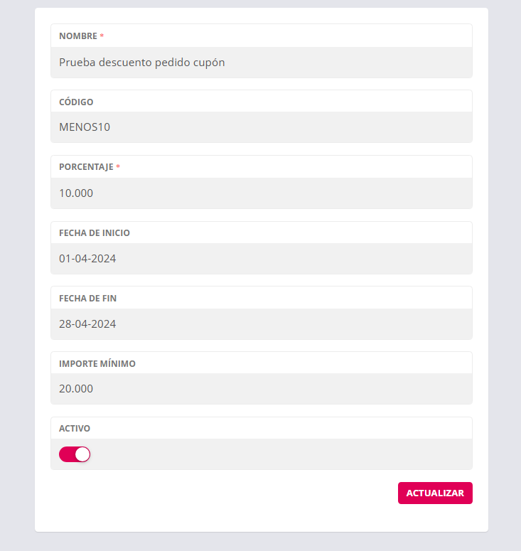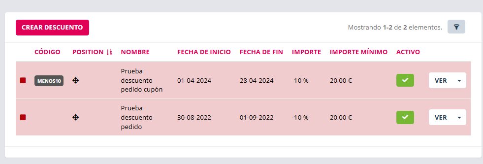 2. Descuentos en pedidos, con o sin cupón. Con ajuste de fecha de inicio y fecha de finalización. Con o sin código, porcentaje de descuento a aplicar, fecha de inicio y de final. Con ajuste de Importe mínimo de compra.