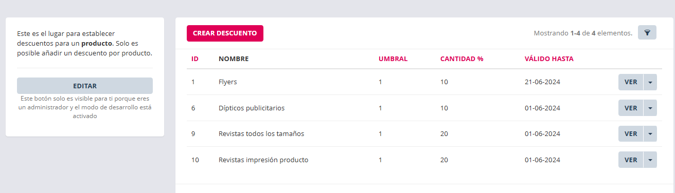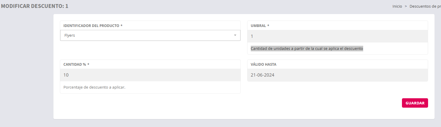 1. Descuentos en productos. Con ajuste de porcentaje de descuento, fecha de final de aplicación del descuento,  y cantidad de unidades de producto a partir de la cual se aplica el descuento.