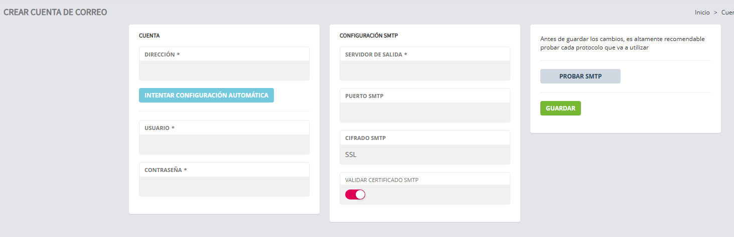 Antes de guardar los cambios, es altamente recomendable probar cada protocolo que se va a utilizar. Para comprobar hacer clic en el botón probar SMTP. Comprobado con éxito. Guardar. - Paso. Desde Ajustes -> Ajustes Generales