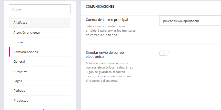 Una vez completado el ajuste de la cuenta de correo que va a usar la tienda acceder a Ajustes-> Ajustes Generales->Comunicaciones y en el ajuste "Cuenta de correo principal" seleccionar la cuenta que se empleará para enviar los mensajes de correo de la tienda.