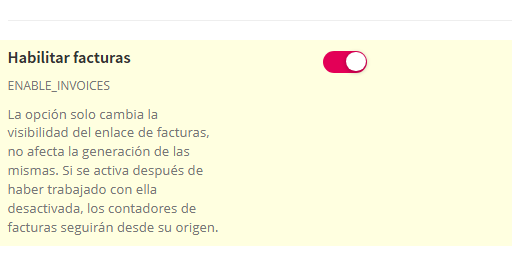La opción solo cambia la visibilidad del enlace de facturas, no afecta la generación de las mismas. Si se activa después de haber trabajado con ella desactivada, los contadores de facturas seguirán desde su origen.