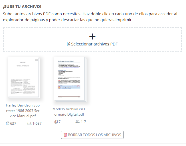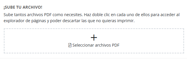 | Texto descriptivo | Texto informativo.Explica cómo funciona la carga de archivos y la gestión de páginas. “Sube tantos archivos PDF como necesites. Haz doble clic en cada uno de ellos para acceder al explorador de páginas y poder descartar las que no quieras imprimir.” |