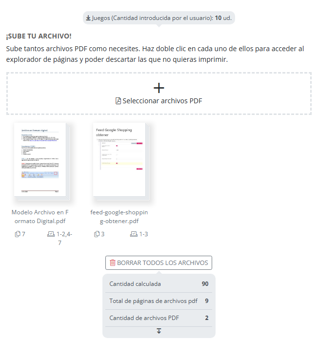 Los datos de páginas para flujo de cantidad de unidades serán la suma de las páginas de todos los PDF subidos. Es decir cada copia será la impresión de todos las páginas de los PDF subidos (a excepción de las páginas descartadas por el cliente desde el Explorador de páginas).