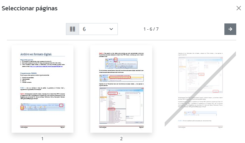 | Seleccionar páginas | Título de ventana. Encabezado superior del modal o ventana emergente. Indica que el usuario está en el entorno de gestión de páginas del PDF. |