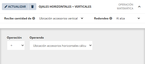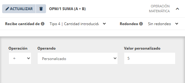 Suma ("Operación" seleccionado en + ), a la cantidad recibida (primer operando), una cantidad de unidades personalizada, concretamente 5 unidades (segundo operando).