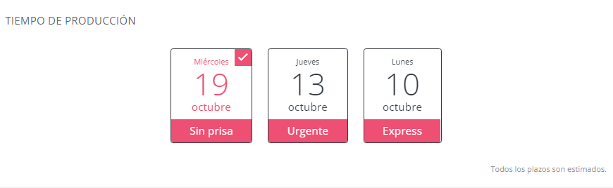 La característica presenta en la vista del cliente la fecha concreta en cada opción pero especifica el texto en margen inferior derecho "Todos los plazos son estimados".