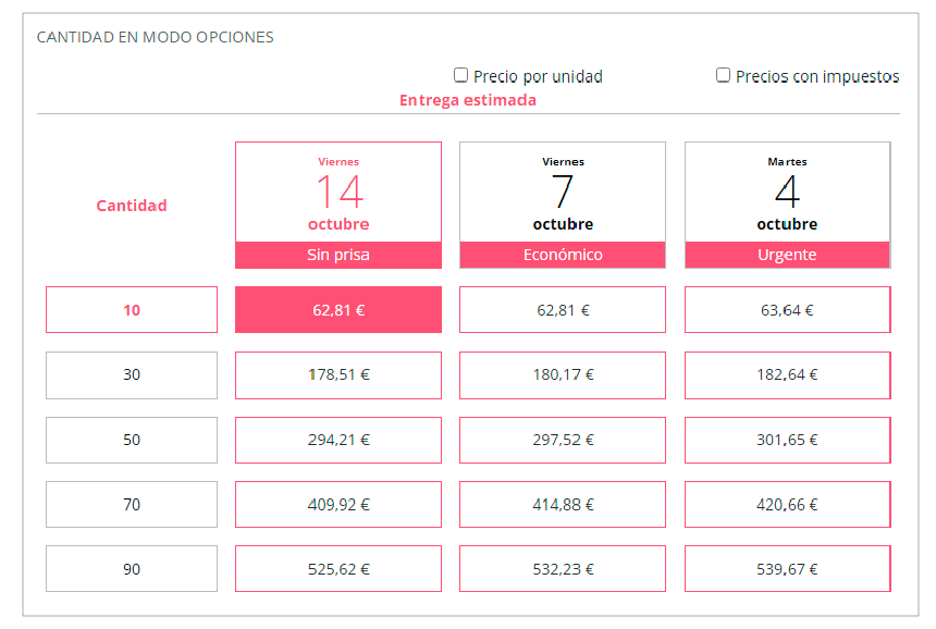 Con la característica de tipo cantidad ajustada en modo Preajustes o en modo Libre y preajustes se puede activar en ella la tabla para que muestre los precios según las opciones de cantidad y tiempos de producción. Siempre y cuando el producto tenga característica de tiempo de producción c.