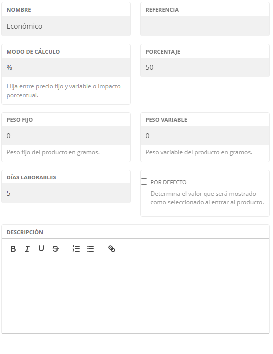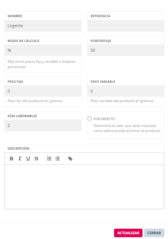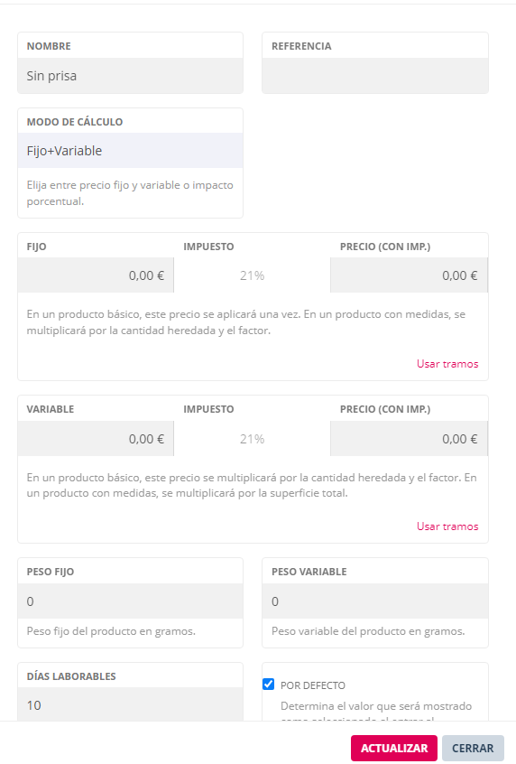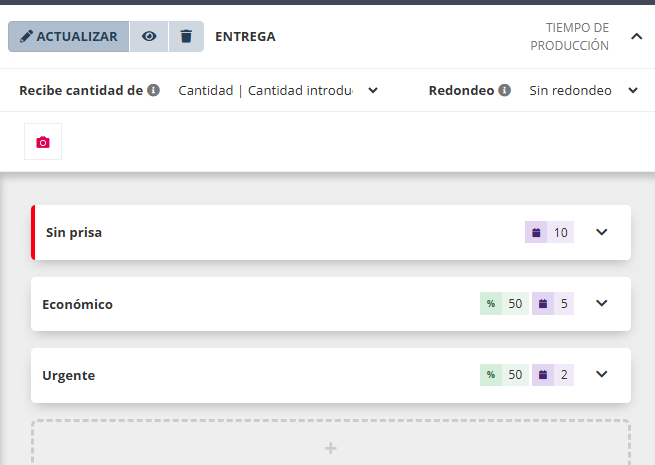 Ver ejemplo en siguiente imagen. Las unidades en color morado son los días laborables que llevará producir el producto. En verde los porcentajes que incrementan el precio del producto.