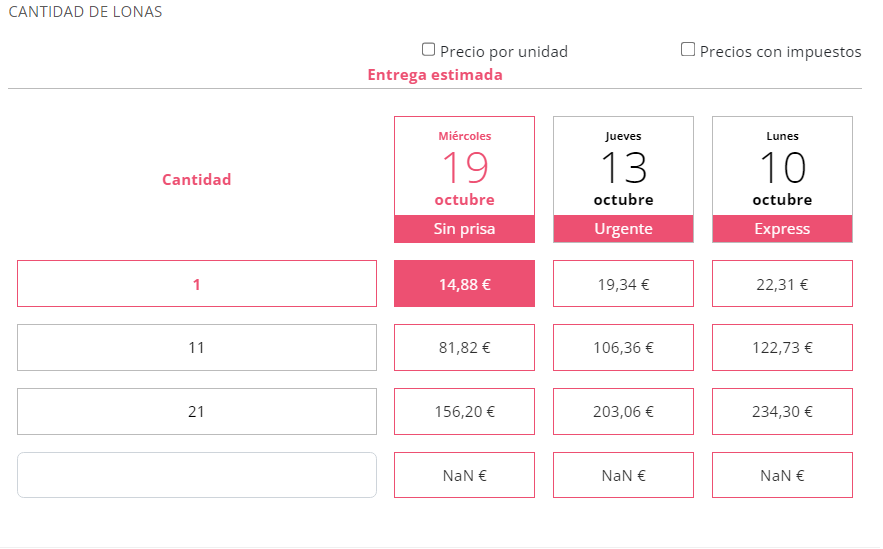 La característica presenta en la vista del cliente fecha concreta en cada opción pero especifica en un texto en margen inferior derecho que "Todos los plazos son estimados".