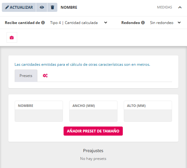 Además presenta el botón AÑADIR PRESET DE TAMAÑO.