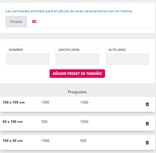 Además presenta el botón AÑADIR PRESET DE TAMAÑO.