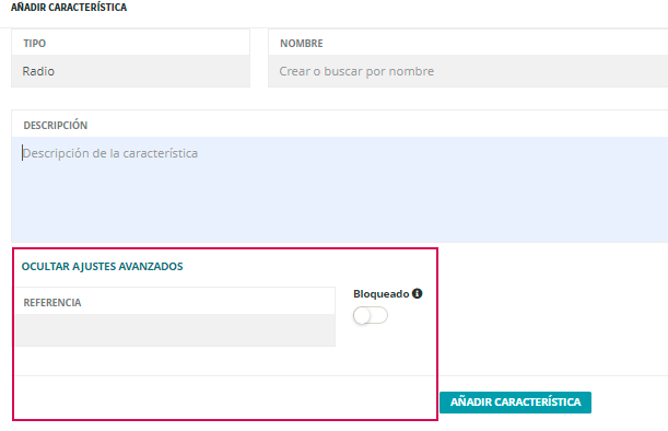 10.b) En última posición en la vertical vemos la interfaz para añadir característica. Siempre aparecerá en última posición en la columna central de la ficha de producto.