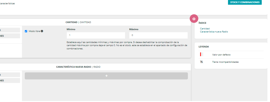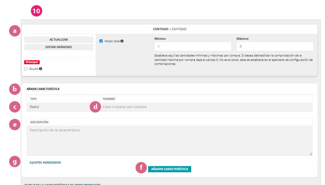 | Añadir característica | Guarda la configuración y añade la característica al producto. |