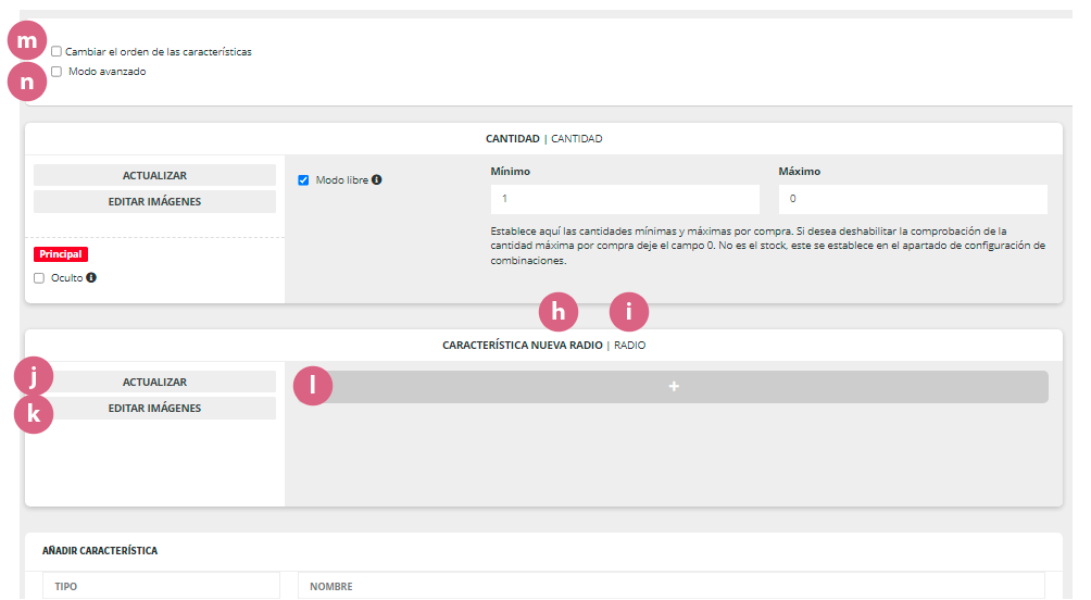 En la columna central de la ficha de producto se encuentra la interfaz de creación de características.