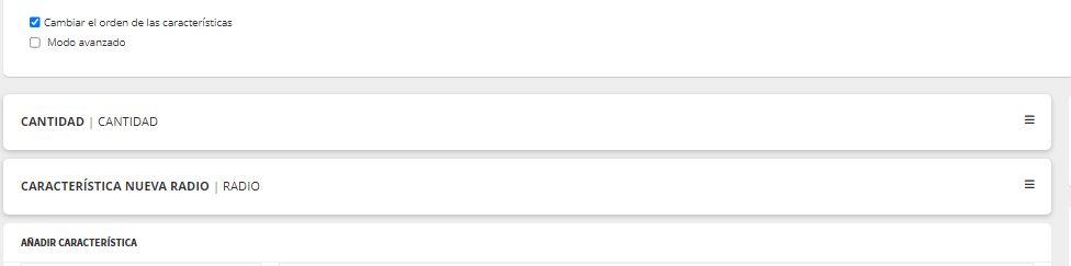 Para ordenar características chequear la casilla "Cambiar el orden de las características que está en la parte superior. Con este modo activado hacer clic en una característica y mantener para reposicionar. El orden de posición de las características será igual al orden en el que se muestren en la vista del cliente.