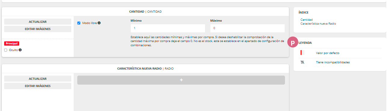 10.a) Cuando se crea un nuevo producto cumplimentando los campos requeridos y pertinentes y se guardan, se crea automáticamente con una característica de tipocantidad llamada cantidad que presenta el icono de estrella destacado en rojo y la etiqueta "PRINCIPAL".