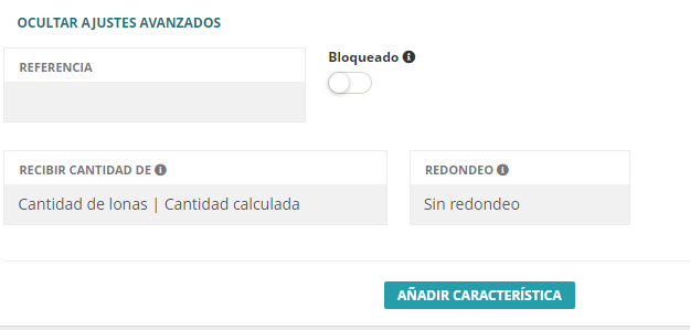 | Recibe cantidad de | Define la cantidad que se utilizará para calcular el precio variable de la característica. Permite vincular el cálculo a otra característica de tipo cantidad o dejarlo en “Ninguno” para multiplicar por una unidad. |