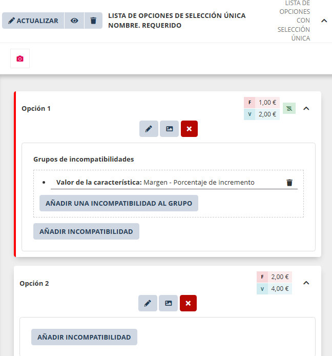 Si un valor solo tiene ajuste de impacto de precio en el campo fijo no necesita recibir cantidad de unidades de la característica. Ha de recibir la unidad mínima que es la opción "Ninguno" y es igual a 1. |