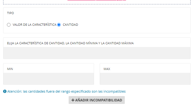 Las incompatibilidades de tipo cantidad permiten delimitar un rango de cantidad de unidades compatibles. Toda cantidad de unidades que estén fuera del rango serán incompatibles.