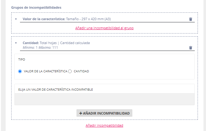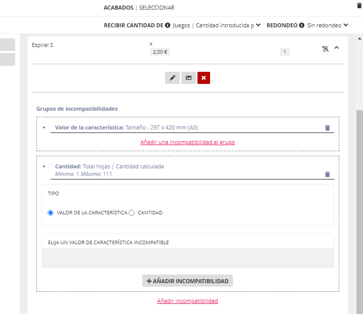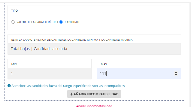 Las incompatibilidades de cantidad tienen en cuenta la cantidad que se ajusta al crear la incompatibilidad y no la "Cantidad Recibida" de la característica en la que está el valor en el que se está creando la incompatibilidad. En este ejemplo respecto a incompatibilidad de cantidad el valor llamado "Espiral S" ignora la cantidad que recibe la característica "Acabados" y la cantidad que tiene en cuenta para ser compatible es la cantidad calculada de la característica llamada "Cantidad de hojas" en rango de 1 a 111 unidades.