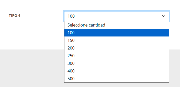 | Cantidad | Valor numérico mostrado. Representa una opción de cantidad concreta que el cliente podrá seleccionar. |