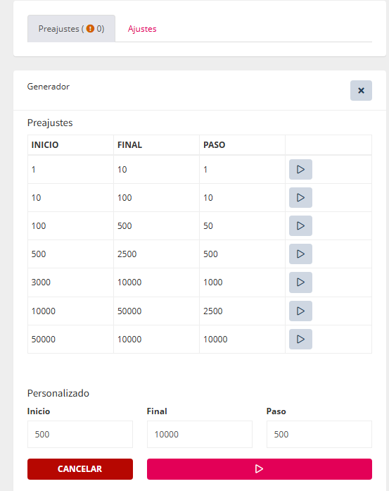 | Generar (▶) | Botón de acción principal. Genera las opciones de cantidad según los valores personalizados definidos. |