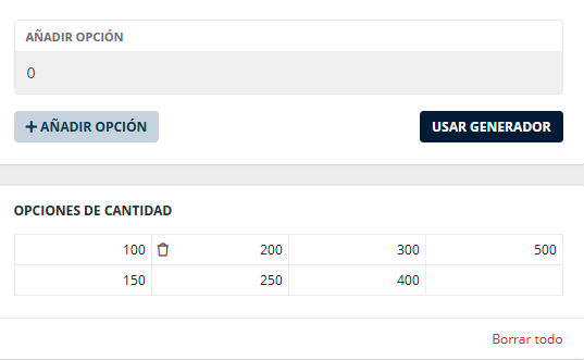 - Se pueden añadir tantas opciones de cantidad como sea necesario.
