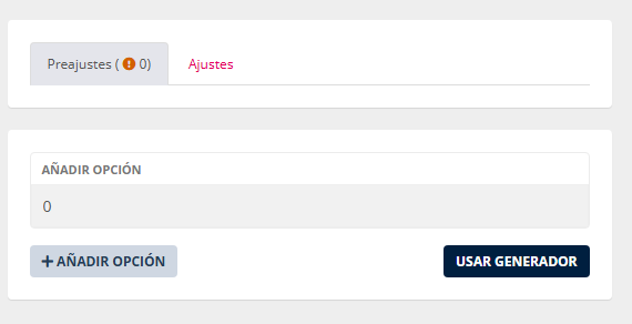 | Usar generador | Botón de acción. Accede al generador de preajustes para añadir múltiples cantidades de forma automática. |